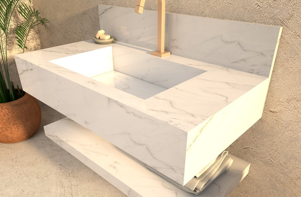 Lavatório em porcelanato branco tipo mármore com as medidas 90x45x20 ralo oculto com tampa