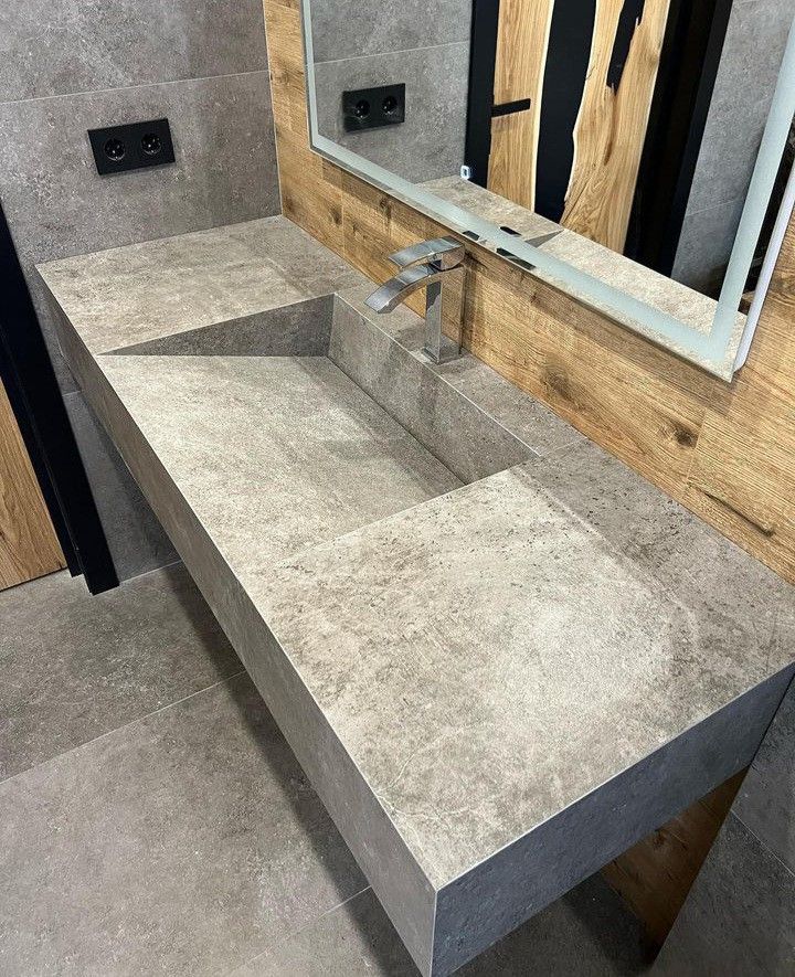 Lavatório em porcelanato cinzento cimento 120x45x15 com ralo oculto acesso inferior para limpeza