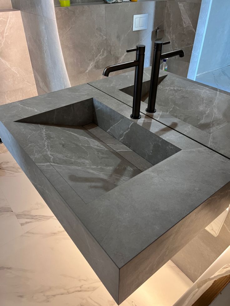 Lavatório em porcelano preto mat com veios claros ralo oculto com tampa 90x45x20